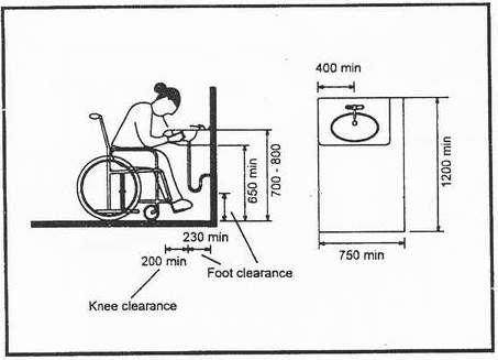 The basin should have appropriate knee clearance and foot clearance space for wheelchair users. | |