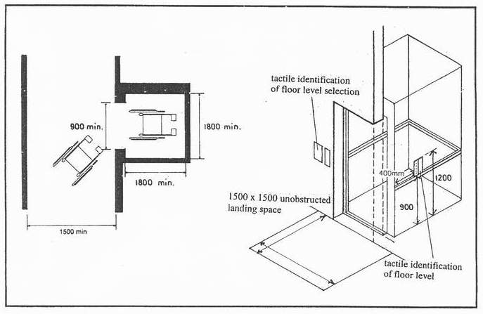 The floor space of lifts should be sufficient for wheelchair users to enter the lifts, manoeuvre within reach of controls, and exit (Fig.4.1a and 4.1b). | |