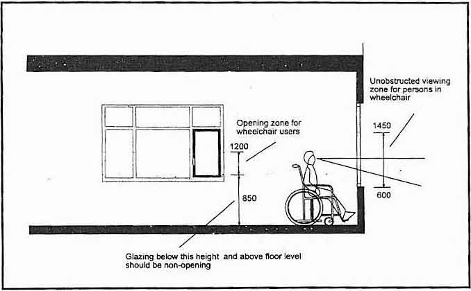 A window should have an unobstructed viewing zone for wheelchair users. | |