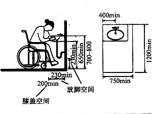 (2)洗脸池下应有足够的空间供坐轮椅者放漆盖和脚;