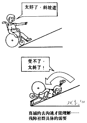 无障碍的沟通 与残障人平等相处的原则: 应小心使用困难带来错误观念与反应的过火言论: (一)若“残障”或相关的字眼在叙述的内容中并非是占有关键位置的字眼,则应避免,不必要把话题或叙述的焦点集中在这一字眼上。 (二)避免渲染绝症、终身不能痊愈、天生残疾或严重伤患等课题,不要利用这类题裁作为赚人眼泪的煽情故事和话题。 (三)不要刻意把一些成功或著名的残障人士描写得像是超人一般。 (四)不要刻意煽倩和渲染残障的状况。 (五)强调残障人士拥有各方面的能力而非强调残障人面对局限。 (六)避免制造残障人“面对悲剧依然勇敢生存”的模式,实际上应避免把残障人士塑造成他人想像的赋予的模式。 (七)观念和语言文字上都必须承认残障人是社会的一份子,在各类表达与叙述的场合,应描述残障人有能力投入社会、参与发展主流、传达的正面与积极形象。 (八)可以在物件上标明有关设施是残障人士适应的,但不可以特别把残障人士另加分类标签。 (九)不要直接或间接上继续传播不正确的传统谬误。人们不应以为残障人是无能或不会享受爱情、缺少性生理、不能过独立的家庭生活。 应注意媒体扮演提高公众意识的关键角色 (一)各媒体工作者须有自律的社会责任精神,在文字表达或图像设计之中,采用可以客观描述残障人状态的图像或专用的词语。 (二)传播残障人或老年人所遇到障碍的信息,避开癫痫患、脑炎后遗病精神分裂病患、发音不全及身体残障者的信息。 (三)传播在环境中克服障碍的好处与成功例证(例如:轮椅专用坡道、盲人横穿道路声音标志、为听觉残障者设置可调音低能公共电话等等。) (四)报导人们感兴趣的残障人的故事和事迹,应侧重其能力与尊严,而不是残疾本身。 (五)为改进传统上的负面观点,应刊登分析文字解除地方迷信或信仰对残障人的负面看法。 (六)关注侧重的真正需求,有深度的探讨残障人的生活课题,不要把残障人的事业与家庭课题极端化。两极化的去把课题渲染成不是英雄事迹就是悲惨生活是不恰当的。应表扬社会上真正有深度、理解残障人需要的例子。